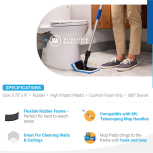 Construction: Microfiber Wholesale’s Contour Microfiber Mop Frame is a unique flexible microfiber mop frame that allows you to shape the mop to evenly cover things like toilets, baseboards, and more! The mop frame features two rows of hook and loop type material that firmly grips our microfiber mops. The frame also features high impact hardware that attaches to our Heavy Duty Telescoping Handle. The hardware allows the frame to swivel 360 degrees. The swivel mechanisms can be tightened to restrict how easily it swivels. Mop pads cling to the frame with hook and loop.