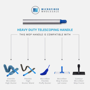 Fabricación: El Mango Telescópico de Alta Resistencia de  Microfiber Wholesale es un mango de aluminio que se extiende con un giro de 42" a 70". Apriete el anillo de compresión de giro hacia abajo, para asegurar que la longitud del mango de la mopa se mantiene en su lugar. Cuenta con una punta roscada para que pueda utilizarlo con nuestros plumeros, así como con nuestros armazónes angulares y de alta resistencia para mopas de microfibra. El diámetro de la parte exterior del mango es de 1 pulgada. Cuenta con una cómoda empuñadura superior de plástico de alto impacto con un práctico punto para colgarla de un gancho. También tiene una empuñadura de espuma ajustable para su otra mano.