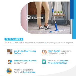 Usos: Las mopas de microfibra de 20" son ideales para la limpieza de cualquier superficie dura, especialmente en áreas de alto tránsito. Las tiras de fregado de la mopa están diseñadas para ser agresivas sin ser abrasivas y son ideales para eliminar las marcas de los suelos. El tamaño de estas mopas las convierte en un producto eficaz para fregar pisos en escuelas, hospitales y zonas que suelen necesitar un poco más de atención. Funcionan muy bien para las empresas de limpieza contratadas y los conserjes que necesitan realizar sus trabajos de limpieza de forma rápida y sin complicaciones. Gracias a la durabilidad de la construcción de microfibra de bucle denso, son ideales para fregar pisos de hormigón y otras superficies rugosas.